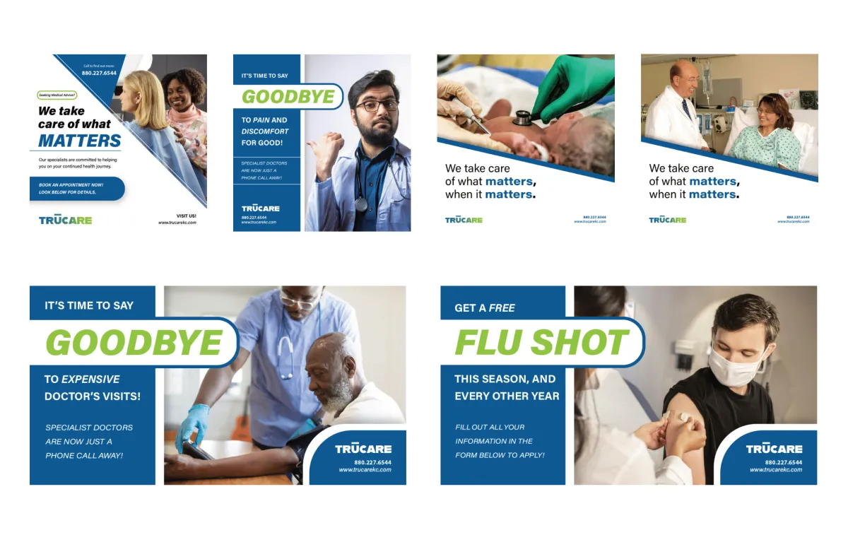 I designed a full suite of social graphics from the ground up, building out a consistent brand identity and applying it across multiple campaign posts targeting different audience pain points, from reducing specialist costs to promoting free seasonal flu shots.
